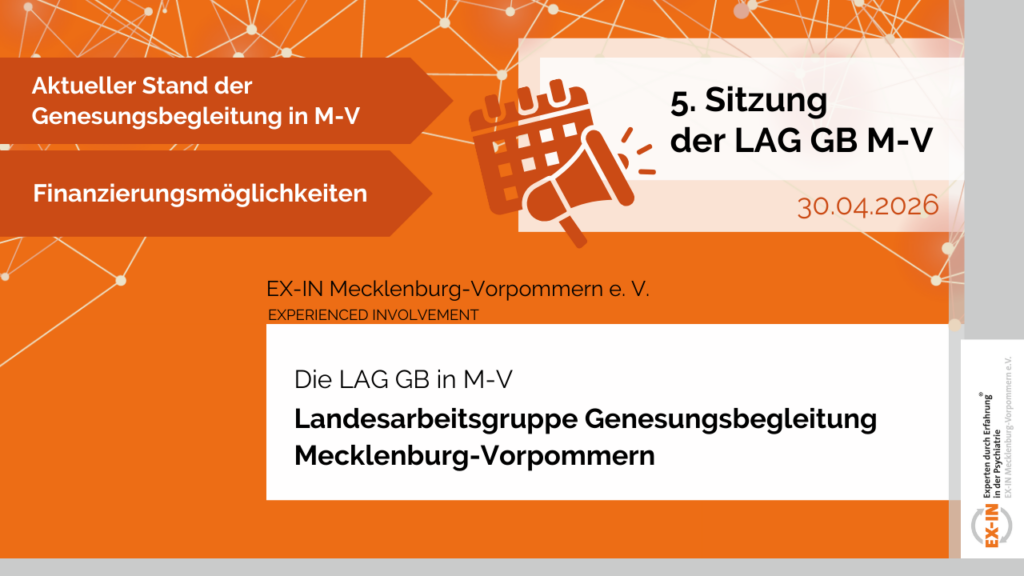 am 9. November 2023 wurde die Landesarbeitsgruppe Genesungsbegleitung in Mecklenburg-Vorpommern (LAG GB M-V) in der ersten konstitutiven Sitzung gegründet.